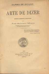 Arte de dizer : curso de dicç;o / estudos reunidos e ordenados por José Antonio Moniz… AUTOR(ES): Moniz, José António, 1849-1917; Braga, Teófilo, 1843-1924, co-autorPUBLICAÇ;O: Lisboa : Guimar;es, Libanio & C ia, 1903DESCR. FiSICA: 299, [1] p. ; 22 cm